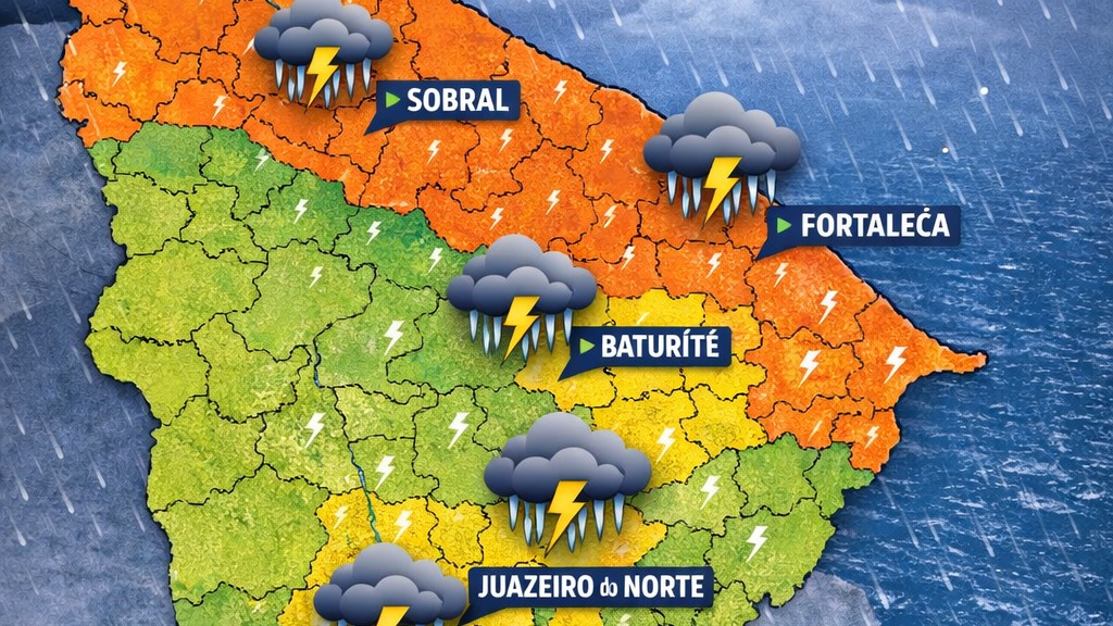 Regiões como Cariri e Jaguaribana também estão na lista de atenção, embora com menor chance — entre **20% e 40% de chuva —, ainda sinalizando risco de temporais isolados.